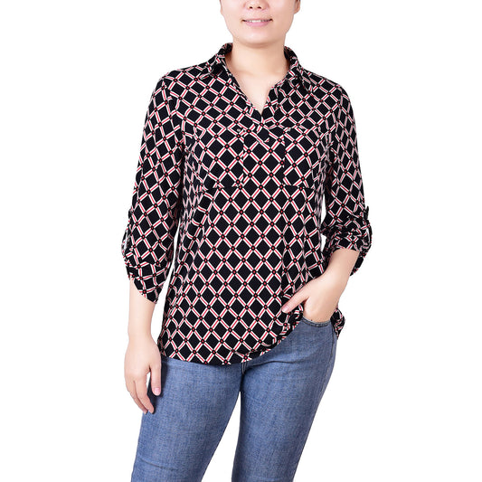 3/4 Roll Tab Sleeve Studded Y Neck Top 1
